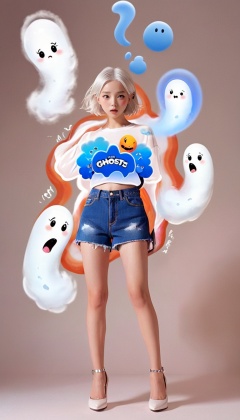 <lora:xl-shanbailing-24-0320Animated Spliced Reality2:0.55>,Animated Spliced Reality,Photorealistic chibi art style,Beautiful woman in denim shorts and high heels,facing the viewers pretending to be scared,both hands on face,artistic,artist,simple volumtric light background,swirling clouds,ColorART,(many cute ghosts with tongues out),chibi,1girl,white hair,