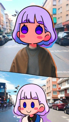 <lora:xl-shanbailing-24-0320Animated Spliced Reality2:0.8>,Animated Spliced Reality,a girl made of anime and reality,anime lines around real girl,photo background,the girl is part reality and part caricature,1girl,(solo:1.5),bangs,white hair,street,city,