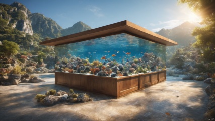 (High Quality), Best Quality, (4K), 8K, Super Detail, (Full Detail), (Masterpiece), (Realistic), Super Detail, (Exquisite Detail),,,Mountain peaks, blue sky, flowing water,Scenery, SDXL, lightning, Aquarium, Villa