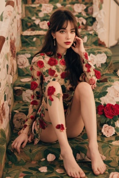 1girl,lbc_rose dress,solo,long hair,breasts,looking at viewer,blush,bangs,blue eyes,brown hair,hair ornament,long sleeves,hair between eyes,jewelry,sitting,full body,flower,earrings,parted lips,barefoot,hair flower,nail polish,feet,legs,petals,bare legs,toes,soles,toenails,stairs,toenail polish,sitting on stairs,rose,<lora:0223 flower_v1:0.8>,