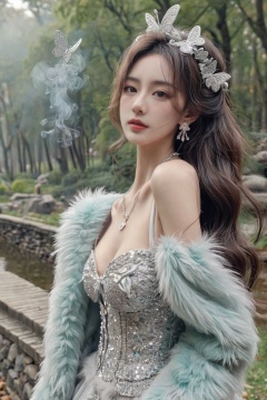 (sweater:1.3),girl,Punk,(zentangle:1.3),Exquisite features,Beautiful and moving,Glamorous,Flowing hair,Smoke,mist surrounds the attractive figure,hubg_jsnh, HUBG_Beauty_Girl, A misty forest,Tyndall ray,A sexy figure,Long,floating hair,big hair,hair strand,En plein air,Verism,chiaroscuro,cinematic lighting,depth of field,sparkle,reflection light,first-person view,pov,three sided view,UHD,anatomically correct,ccurate,textured skin,super detail,high details,award winning,best quality,high quality,retina,HD,16k,bed,1girl,slender,thin,big breasts,cleavage,(fur_coat:1.5),flat abdomen,crystal_earrings,headwear,headpiece,tiara,maid_headdress,hair_ribbon,hair_bobbles,hair_bow,butterfly_hair_ornament,clover_hair_ornament,earrings,necklace,jewelry,crystal,tassel,arm_garter,pendant,