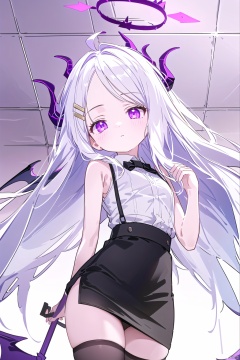 long hair, bangs,hair ornament, very long hair, purple eyes,ahoge, white hair,wings, horns,hairclip,parted bangs, halo,demon girl, demon horns, forehead,demon wings, low wings, multiple horns, hina\(bluearchive\), hinaBA,hinaCasual