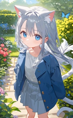 original,(masterpiece),(illustration),(extremely fine and beautiful),perfect detailed,photorealistic,(beautiful and clear background:1.25),(depth of field:0.7),(1 cute girl with (cat ear and cat tail:1.2) stands in the garden:1.1),(cute:1.35),(detailed beautiful eyes:1.3),(beautiful face:1.3),casual,silver hair,silver ear,(blue hair:0.8),(blue ear:0.8),long hair,coat,short skirt,hair blowing with the wind,(blue eye:1.2),flowers,(little girl:0.65),butterflys flying around,, masterpiece, best quality, masterpiece, best quality