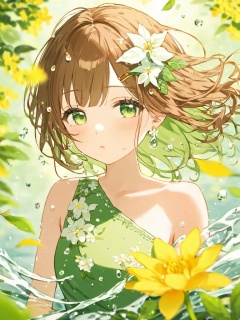 1girl,solo,looking_at_viewer,blush,bangs,brown_hair,hair_ornament,dress,holding,bare_shoulders,green_eyes,upper_body,flower,earrings,parted_lips,green_hair,sleeveless,hair_flower,medium_hair,blurry,sleeveless_dress,floating_hair,leaf,white_flower,green_dress,water_drop,blurry_foreground,bouquet,yellow_flower,