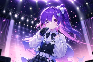 (masterpiece), (best quality), illustration, ultra detailed, hdr, Depth of field, (colorful),[miwano rag],[wlop],[[wakaba]],[haneru],deyui, 1girl, eyepatch, virtual youtuber, looking at viewer, solo, purple eyes, black shirt, skirt, multicolored hair, stuffed bunny, ahoge, gloves, holding, microphone, stuffed toy, bow, long sleeves, black gloves, white jacket, heart, bangs, jacket, shirt, streaked hair, bowtie, stuffed animal, plaid, glowstick, ponytail, plaid skirt, stage, heart ahoge, purple hair, chain, pink hair, blush, parted lips, hair bow, one eye covered, holding microphone, long hair, sidelocks, side ponytail, hair ornament, microphone stand, black belt, buttons, cropped jacket, belt, stage lights, pink bow, white hair, medium hair, ribbon