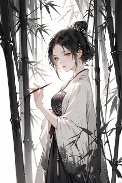 A beautiful girl standing upright in a bamboo forest, delicate face, calm and elegant, Tyndall light effect, Chinese ink painting style, Zhang Daqian, black and white ink, momentary, superbly written style,