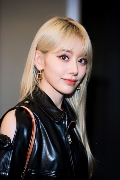 ultra-high definition,extreme detail,8k,realistic,(masterpiece:1.3),(best quality:1.3),(photorealistic:1.4),4k,detail face,1,v,blonde hair,1girl,long hair,looking at viewer,jewelry,earrings,blurry,blurry background,upper body,jacket,bangs,smile,closed mouth,realistic,ear piercing,piercing,black nails,lips,selfie,solo focus,grey background,long sleeves,solo,black eyes,<lora:_20240321113412-000006:0.8>,