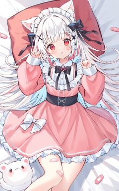 (best quality), ((masterpiece))1girl, long sleeves, lying, dress, solo, frills, animal ears, frilled dress, red eyes, on back, sleeves past wrists, tail, bandaid on leg, parted lips, pink dress, bandaid, long hair, white hair, x hair ornament, bow, puffy sleeves, multicolored hair, bangs, looking at viewer, pillow, puffy long sleeves, hands up, maid headdress, virtual youtuber