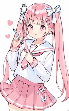 (best quality), ((masterpiece))1girl, solo, twintails, hair ornament, pink hair, sailor collar, rabbit hair ornament, skirt, long sleeves, long hair, shirt, white background, white shirt, white sailor collar, pleated skirt, pink skirt, parted lips, very long hair, v, blush, bow, bangs, looking at viewer, serafuku, hair bow, holding, school uniform, pink sailor collar, white bow, heart, hairclip, simple background, stylus, rabbit, flower, necktie