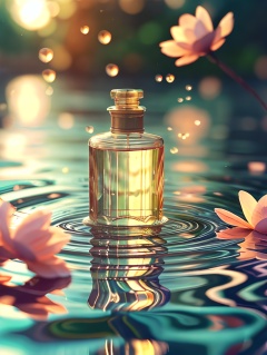 no humans,bottle,water,blurry,reflective water,depth of field,scenery,reflection,(flower:0.7),(cherry blossoms:0.5),ripples,XSSY