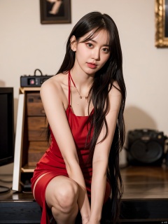 1, 1girl, long hair, brown hair, solo, dress, brown eyes, looking at viewer, holding, red dress, parted lips, bare shoulders, indoors, lips, sleeveless, ((poakl)),nice_body,full_body