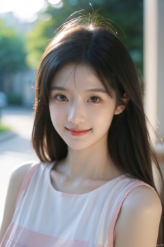Cute girl,14 years old, sweet,  blushing, sun lighting, sunlight on the girl's face, very attractive, charming, film, KODAK Portra 400, Hasselblad photography, realistic, detailed, 8K RAW, 4k photo, masterpiece,outdoor,upper_body,good structure,smile,