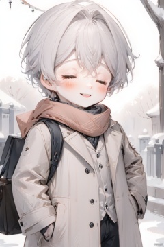 Solo, Blush, a little boy, smile, body, eyes closed, white hair, male focus, outdoor, bag, scarf, gray coat, child, Boy,气质男孩
