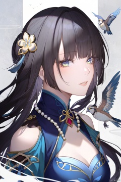 masterpiece, best quality,1girl, bird, yellow eyes, owl, long hair , parted lips, solo,bangs, portrait, lips,blunt bangs, yelashes , full_body,