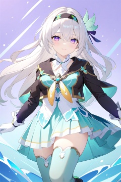 long hair,breasts,fireflySR,bangs,hair ornament,gloves,dress,hair between eyes,purple eyes,multicolored hair,white hair,hairband,elbow gloves,white gloves,black hairband,skirt,green thighhighs,long sleeves,ribbon,jacket,hair ribbon,hairband,yellow necktie,black jacket,wavy hair,cropped jacket,black footwear,