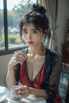 1girl,solo,breasts,looking at viewer,black hair,hair ornament,dress,holding,cleavage,jewelry,medium breasts,upper body,earrings,parted lips,detached sleeves,indoors,necklace,hair bun,bracelet,cup,lips,window,chinese clothes,red dress,table,single hair bun,ring,plate,teacup,realistic,red lips,teapot,tea,saucer,lattice,pov across table