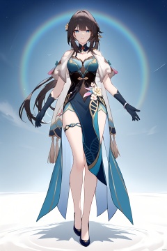 ruanmei, def clothe, 1girl, gloves, blue eyes, black hair, dress, breasts, high heels, chineseclothes,