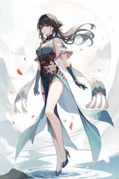 ruanmei, def clothe, 1girl, gloves, blue eyes, black hair, dress, breasts, high heels, chineseclothes,