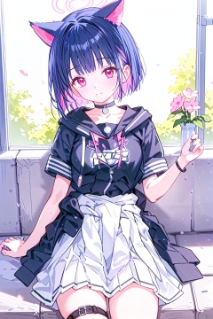 kazusaBA,short hair, breasts, bangs, skirt,shirt, black hair, red eyes,animal ears, medium breasts, closed mouth, jacket, white shirt, pink hair, short sleeves, multicolored hair, pleated skirt, choker, cat ears, blunt bangs, pink eyes, two-tone hair, official alternate costume, black jacket, thigh strap, mask, alternate hairstyle, black choker, halo, white skirt,colored inner hair, clothes around waist, jacket around waist,kazusaBand,