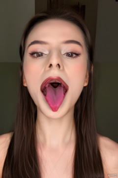 1girl solo long hair looking at viewer open mouth brown hair brown eyes teeth ,tongue tongue out ,lips realistic uvula,open mouth,ens, huangyuyao, Real, star guardian neeko, wunv,choker,,
