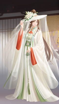 (best quality), ((masterpiece)), (highres), illustration, original, extremely detailed,  <lora:古风·鸢行风上:0.7>yuan, 1girl, solo, white background, green eyes, brown hair, simple background, long hair, flower, hat, wide sleeves, tassel, chinese clothes, standing, dress, hanfu, long sleeves, full body, see-through, jewelry, white flower