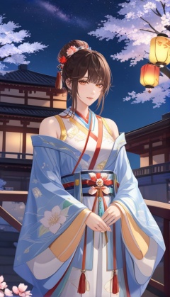 (best quality), ((masterpiece)), (highres), illustration, original, extremely detailed, <lora:古风·鸢行风上:0.7>yuan, 1girl, sky, solo, umbrella, japanese clothes, lantern, night, kimono, hair ornament, architecture, oil-paper umbrella, night sky, kanzashi, flower, holding, star \(sky\), off shoulder, east asian architecture, hair flower, bangs, bridge, floral print, sash, outdoors, starry sky, tattoo, building, cloud, bare shoulders, holding umbrella, food, obi, paper lantern, blunt bangs, standing, petals, red flower, water, looking at viewer, candy, wide sleeves, breast tattoo, collarbone, black hair, fish, railing, chest tattoo, long sleeves, ripples, breasts, closed mouth, reflection, print kimono, hair bun, candy apple, tree, brown hair, pagoda, single hair bun, cloudy sky, reflective floor, tassel, multicolored clothes, multicolored kimono
