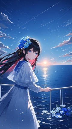tianliang duohe fangdongye,chen bin,omone,,((masterpiece, best quality)),beautifuldetailedlighting,1girl, solo, long hair, looking at viewer, bangs, blue eyes, black hair, hair ornament, long sleeves, dress, bow, closed mouth, flower, outdoors, sky, cloud, hair flower, sailor collar, water, from side, blue sky, capelet, ocean, cloudy sky, blue flower, blue theme, horizon