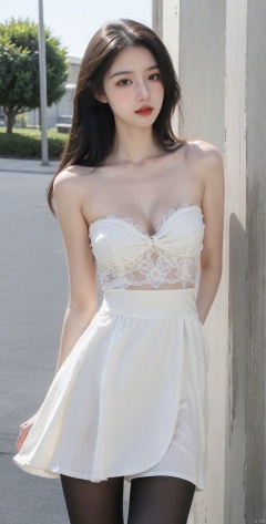 (masterpiece, best quality:1),finely detailed,1girl,solo,fair_skin,simple background,depth of field,blurred background,evening_gown,Hip-wrapped tight skirt,microdress,taut_dress,miniskirt,pencil_skirt,strapless,sleeveless,White dress,chiffon_skirt,shallow smile,Black hair,straight hair,(long hair:1),Thin,21 years old,Advanced,lipstick,medium breasts,cleavage,collarbonea,slender,black_pantyhose,lace,standing,incredibly absurdres,photo,white clothes,Cinematic Lighting,Tyndall effect,Slender waist,(full_shot:1.5),