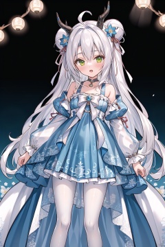 ((nsfw)), stage, spotlight, idol, singing, 1girl, solo, long hair, bangs, hair ornament, long sleeves, dress, hair between eyes, very long hair, skirt, green eyes, collarbone, flower, white hair, pantyhose, horns, puffy sleeves, hair flower, hair bun, black footwear, sleeves past wrists, bell, double bun, blue dress, puffy long sleeves, white pantyhose, dragon horns, blue flower, blue , otwear, dragon girl, dragon tail, antlers, gradient dress, Gauze skirt, gauze dress, yuexi