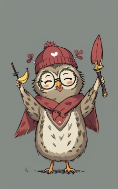 comic_style, children's_painting_style, no humans, fruit, food, bird, closed eyes, hat, heart, smile, ((weapon)), holding, standing, owl, simple background, looking at viewer, grey background, eating, closed mouth, animal, ^ ^, animal focus, arms up, clothed animal, open mouth, chicken, glasses, sketch, walking, facial mark, arm up,<lora:好吃米-儿童绘本:0.8>,