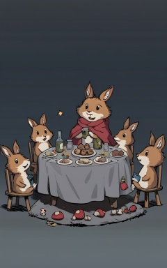 comic_style, children's_painting_style, bunny, sitting, no humans, holding, bottle, multiple others, outdoors, night, mushroom, food, standing, cup, sky, chair, grey background, animal, open mouth, blanket, star, (symbol), blush stickers, smile, multiple boys, table, plate, walking, simple background, shadow, parody, looking at viewer, animal ears, multiple furry boys,<lora:好吃米-儿童绘本:0.8>,