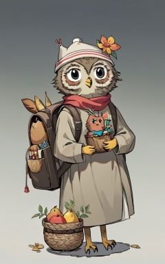 comic_style,children's_painting_style,bird,no humans,owl,bottle,bag,basket,flower,solo,grey background,animal focus,simple background,backpack,animal,hair ornament,hat,looking at viewer,clothed animal,holding,bread,standing,bug,outdoors,leaf,shadow,sitting,stick,black eyes,food,gradient background,fruit,closed mouth,<lora:好吃米-儿童绘本:0.8>,