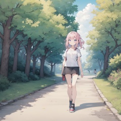 <lora:mine:1>,1 Girl in blue t-shirt and skirt walking on a park trail