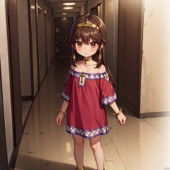 masterpiece, bestquality, Sera, 1girl, little girl, solo, long hair, brown hair, dress, bare shoulders, brown eyes, jewelry, choker, dark skin, bracelet, dark-skinned female, tiara, anklet, egyptian, Standing,