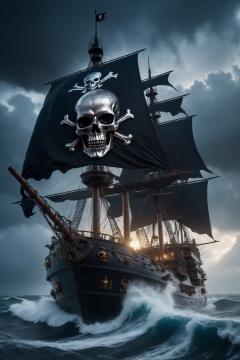 Realistic, hyper detailed, award winning masterpiece, full body portrait, ((ultra-high resolution 16k intense color portrait)), in the deep ocean, rough sea waves a large pirates ship with a black skull flag on top, ultra realistic, Hyper, vibrant light, storm, clouds, lightning, rough weather cinematic background