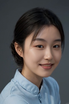 (close up portrait of a woman of east asian descent),happy and smile expression, looking at camera, slight stubble, dark hair with undercut hairstyle, clean skin, brown eyes, wearing dark shirt, soft lighting, gray background, shallow depth of field, high-resolution image, studio shot, headshot, photographic realism., masterpiece, best quality, aunt, 1girl, girl