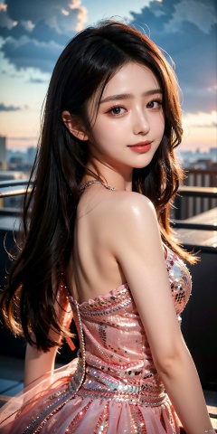 ,Frontal photography,Look front,evening,dark clouds,the setting sun,On the city rooftop,1girl,,,black hair,long hair, , muted tones, pastel colors, high contrast, (natural skin texture, A dim light, high clarity) ((sky background))((Facial highlights)), , yaya,dress, 1girl