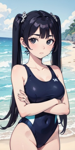 1girl, solo, long hair, looking at viewer, black hair, hair ornament, twintails, closed mouth, swimsuit, cowboy shot, outdoors, day, black eyes, one-piece swimsuit, ocean, beach, crossed arms, blue one-piece swimsuit, realistic