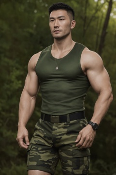 Best quality, masterpiece, ultra-high resolution, detailed background, game_cg, military camp, a man, Asian, 35 years old, muscular, green tight sleeveless top, chest hair, green camouflage military short pants, black combat knee boots, Dog Tag,standing, full body portrait, looking at me,jzns, jzns, zjh