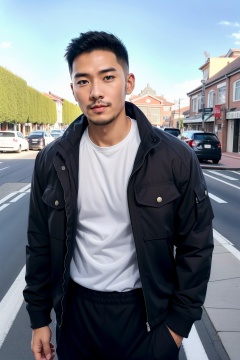LianmoNan,1boy,male focus,jacket,pectorals,solo,shirt,open jacket,open clothes,short hair,outdoors,looking at viewer,<lora:man_face_04_v1.0:1>,, masterpiece,best quality,