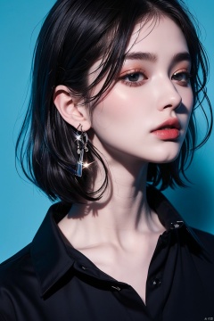 (masterpiece:1.2), (best quality:1.2),(high quality:1.2),(realistic:1.2), (photorealistic:1.2) ,(official art:1.2),(extremely detailed:1.2),1girl, solo, looking at viewer, short hair, simple background, shirt, black hair, jewelry, earrings, parted lips, collared shirt, black eyes, lips, black shirt, blue background, portrait