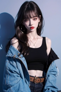(masterpiece:1.2), (best quality:1.2),(high quality:1.2),(realistic:1.2), (photorealistic:1.2) ,(official art:1.2),(extremely detailed:1.2),1girl, solo, long hair, looking at viewer, bangs, brown hair, shirt, jewelry, jacket, white shirt, upper body, earrings, belt, necklace, off shoulder, lips, black jacket, eyelashes, **** top, purple background, red lips