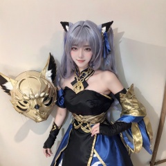 best quality,masterpiece,realistic,photorealistic,1girl,solo,looking at viewer,smile,long black hair,bangs,standing,full body,sparkle cosplay costume,cosplay,twintails,dress,detached sleeves,bell,single glove,hair ornament,bare shoulders,sandals,fox mask,mask on head,simple background,<lora:小塔姆:0.8>,