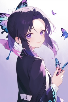1girl, kochou shinobu, solo, looking at viewer, smile, closed mouth, upper body, bug, butterfly, purple background, artbook<lora:lbc_hudieren240323_v1.0:0.9>,