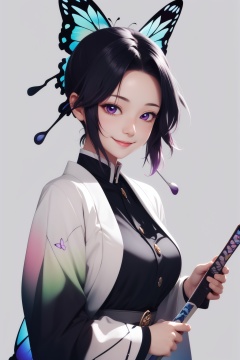1girl,kochou shinobu,solo,breasts,looking at viewer,smile,simple background,long sleeves,closed mouth,grey background,holding weapon,butterfly,artbook,<lora:lbc_hudieren240323_v1.0:0.8>,