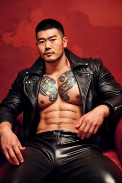 zhuangxiong,muscular male,male focus,bara,man in his late twenties reclines with confidence against a deep red backdrop. His black leather jacket exude a bad-boy aura,complemented by his black hair and an array of tattoos.,leather pants,
