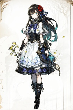 1girl, ,white background, skirt,looking at viewer, boots, simple background, full body, standing,Long hair,flower, mysterious pattern