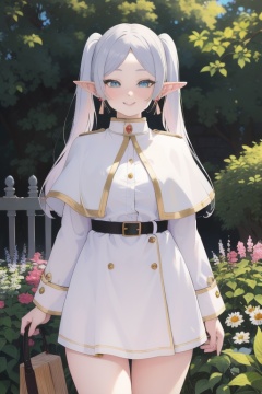masterpiece,best quality,ultra-detailed,glowing light,(detailed background, complex background:1.2),(perfect face, detailed face),(mature female, milf:1.4),full-face blush,smile,parted lips,thighs,frieren,1girl,long hair,pointy ears,twintails,jewelry,elf,earrings,capelet,white capelet,long sleeves,parted bangs,dress,holding staff,belt,flower,(outdoors, garden),<lora:lbc_Frieren24324_v1.0:1>,