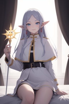 1girl,belt,capelet,closed mouth,earrings,elf,flower,frieren,holding,holding staff,jewelry,light rays,long hair,long sleeves,looking at viewer,on bed,outdoors,parted bangs,pointy ears,ribs,ring,shirt,smile,solo,wagashi,white capelet,white dress ,sexy pose, chinese clothes,dress,panties,see-through,skirt,solo,illustration of a anime girl imagination,art brut,polychromatic neon,phantasmagoria,vray,polychromatic noir,hyperrealistic photo by Seebas Apterus and Larry Bell art,blending,smooth,serious,detailed expressions,artstyle,detailed eyes,HDR,UHD,64k,RTX,sharp,sharp focus,highly detailed,intricate detail,professional,artistic flow,ultra detailed,high resolution photography,(bright colors),<lora:lbc_Frieren24324_v1.0:1>,