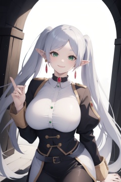 (masterpiece, best quality),1girl,frieren,long hair,twintails,pointy ears,earrings,jewelry,(parted bangs),green eyes,smile,closed mouth,huge breasts,white choker,<lora:lbc_Frieren24324_v1.0:1>,